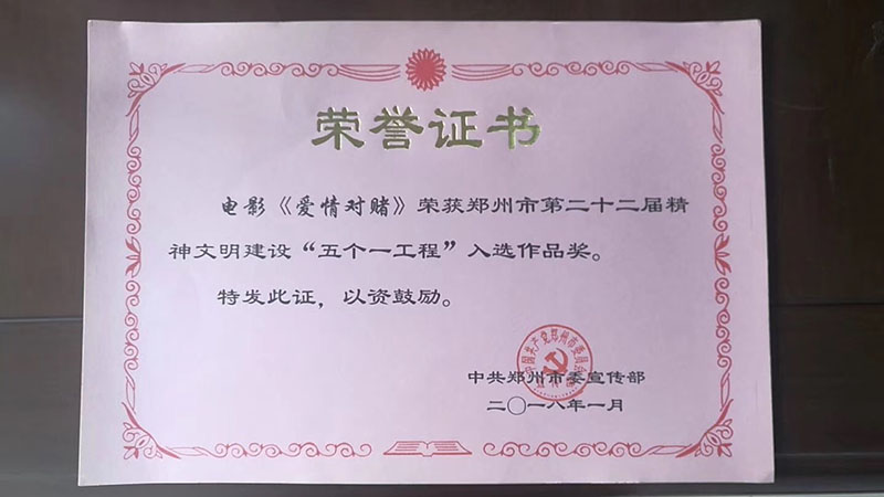 【本网讯】 由星线影业、义广天下制作,黄平编剧、邱晓军导演,黄平、邱晓军联合制片的青春、爱情、励志喜剧电影《爱情对赌》在激烈的竞争中胜出,入选郑州市委宣传部“五个一”工程奖。